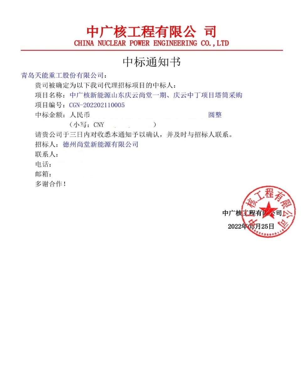 乐投(中国)重工中标中广核山东庆云尚堂一期、庆云中丁项目塔筒采购